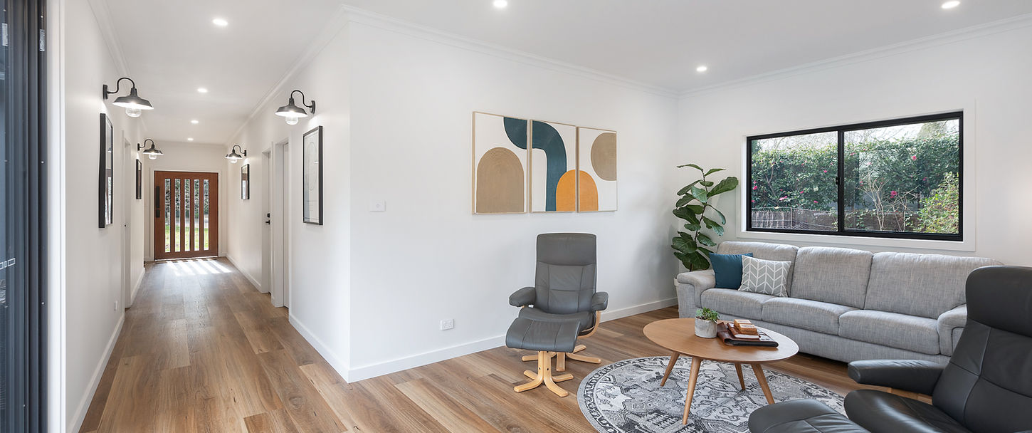 A new architect-designed home beautifully merges with a renovated original cottage via a wide, light-filled hallway, creating a cohesive and character-rich space.